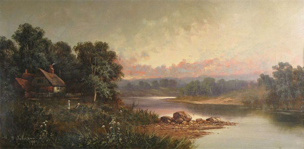 Sidney Yates Johnson (19/20th Century) Children by a cottage on the banks of a river Signed...