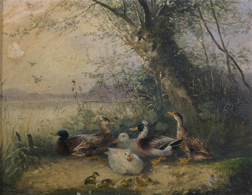 Continental School c. 1900 Ducks and ducklings by a lake Signed indistinctly Oil on panel ...