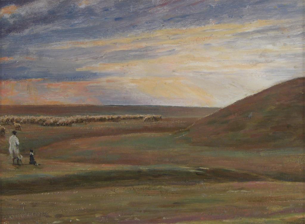 Edgar Barclay (1842-1913) Sheep near the round barrow, Stonehenge Signed with initials Oil on board 22 x 30.5cm; 18 x 12in