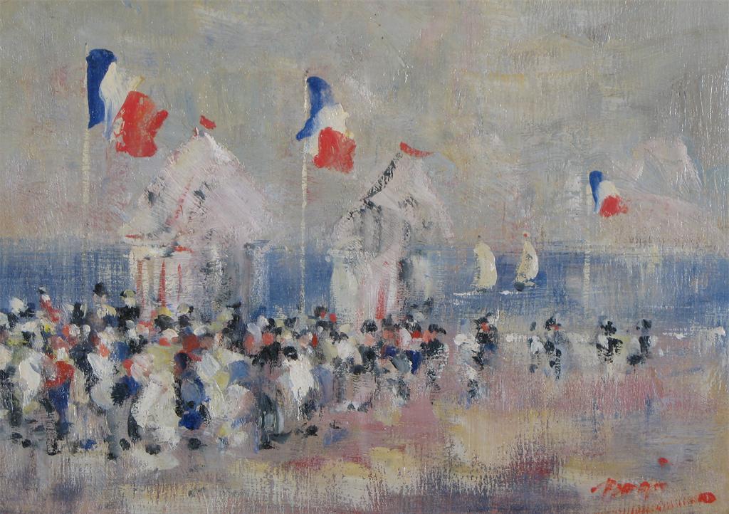 French School early 20th Century Figures gathered on the shore Signed indistinctly Oil on...