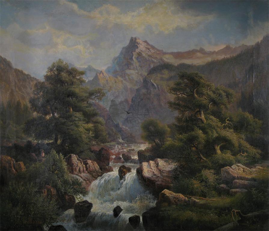N. Mocek (Czech c. 1900) Mountain river landscape Signed Oil on canvas 46 x 55cm; 18 x 21