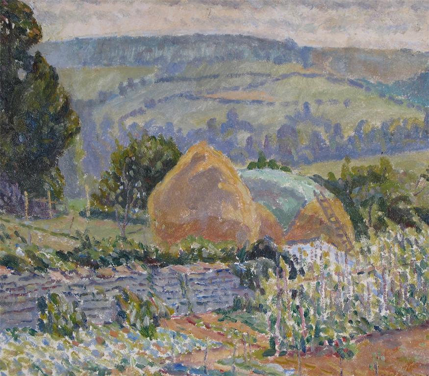 Vincent Henry Lines (1909-1968) Haystacks in a landscape Signed Oil on board 29.5 x 34cm; 11...