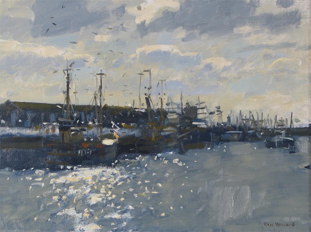 ^ Ken Howard, R.A., N.E.A.C., R.W.S. (b. 1932) Newlyn, Bright Morning Signed Oil on canvas 31 x 41cm; 12 x 16in