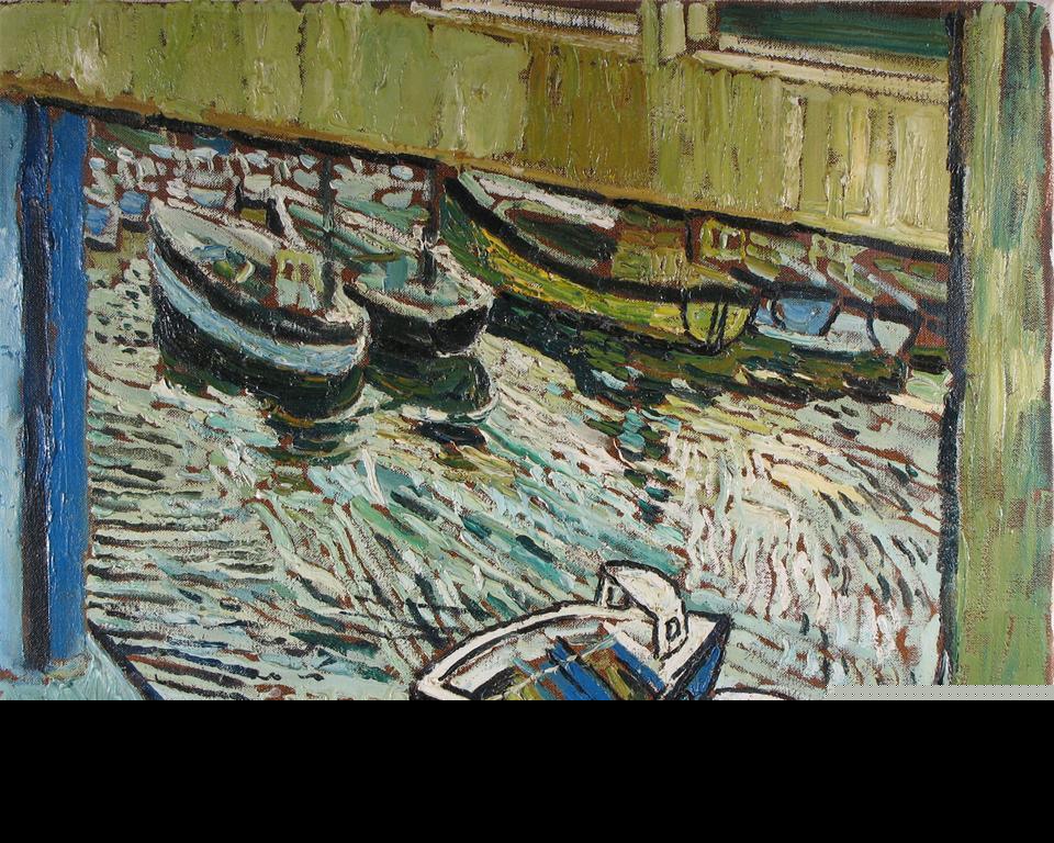 John Bratby (1928-1992) Boats and Window Signed, dated 63 and titled on the overlap, Oil on canvas, unframed 40 x 51cm; 15 x 20in