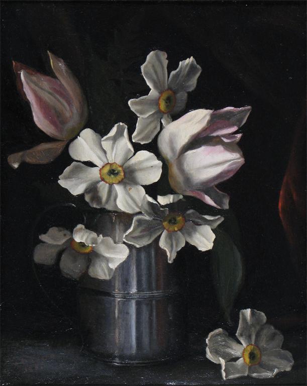 A. P. Swan (19th Century) Still life of narcissi in a pewter tankard Signed and dated 1885 Oil...