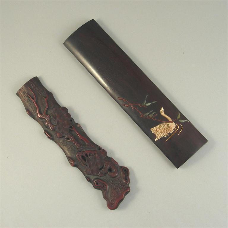 Two Chinese arm rests, one zitan and inlaid with a mother of pearl goose, the other bamboo carved with a pine tree, 27cm. (2)