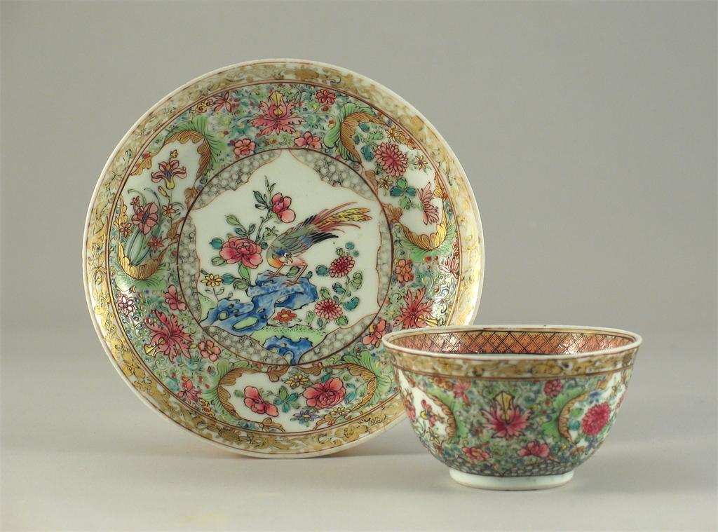 A Chinese famille rose teabowl and saucer, elaborately painted with a bird upon rocks amidst flowers. A well repaired section to the saucer. Yongzheng 1723-35. (2)