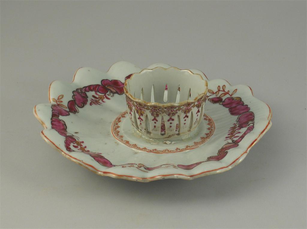 A Chinese famille rose stand, with a reticulated trembleuse holder and a fluted tray. Damaged. 22cm.