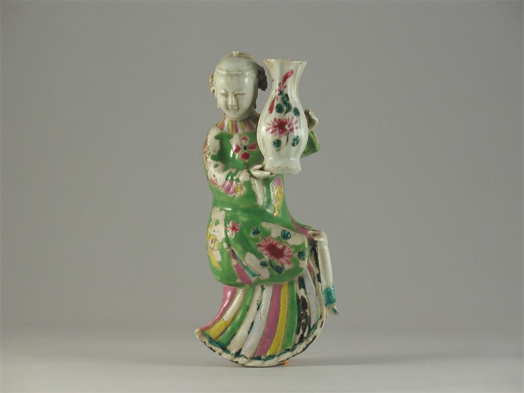 A Chinese famille rose wall vase, modelled as a woman holding up a small vase. The enamels flaked. Late 18th/early 19th century, 21.5cm.