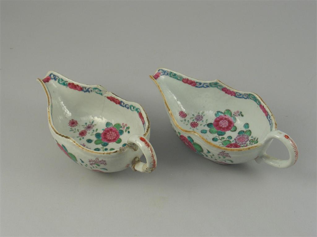 A pair of Chinese famille rose silver shaped sauceboats, each painted with flowers. One badly damaged. 18th century, 20.5cm. (2)