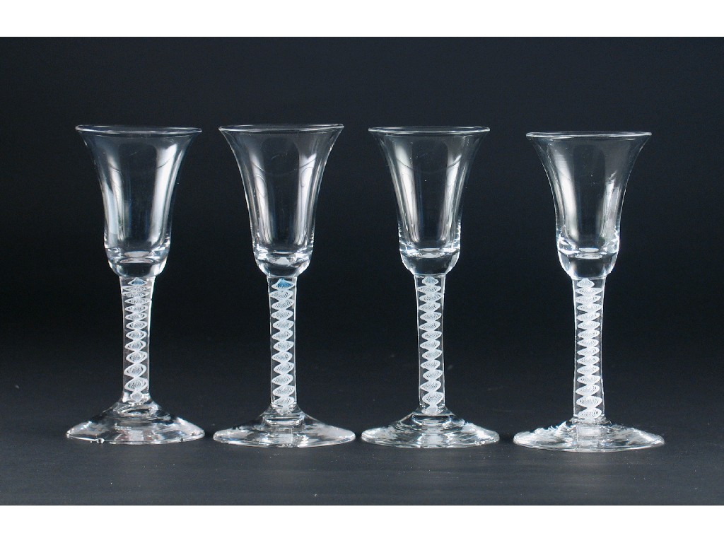 A set of four wine glasses, with bell bowls on opaque twist stem. Three with foot-rim chips. c.1770, 16cm. (4)