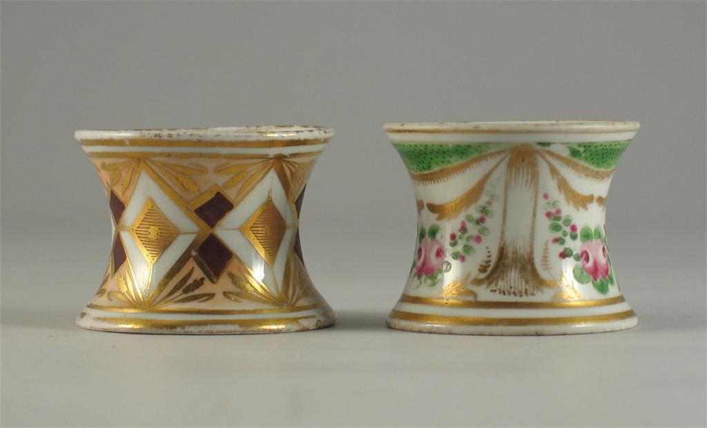 Two English porcelain egg rings, one painted with flowers, the other with diamonds. Both with wear. Early 19th century, 5cm. (2)