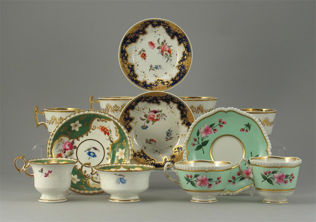 Four English porcelain trios, one Flight, Barr and Barr, painted with pink roses on an oatmeal ground, one Minton, painted with flowers on green borders and two Ridgway pattern No.2/739, all early 19th century. (12)