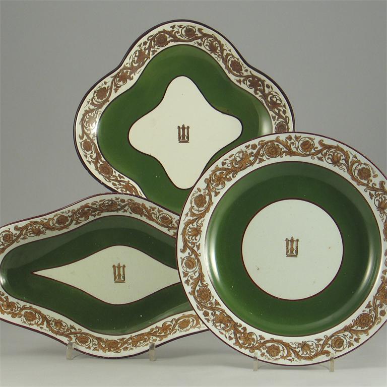 A Wedgwood pearlware part service, decorated with bands of scrolling foliage and flowers in wide green borders, impressed marks. Some flaking to the rims. Early 19th century, comprising: ten plates, five shaped dishes and two oval dishes, 30cm. Max. (17)