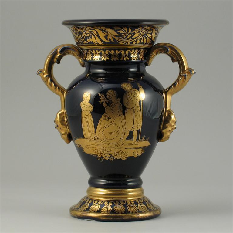 A blue ground Ironstone vase, gilt decorated with three figures, no marks. Two feint rim cracks. c.1830, 21.5cm.