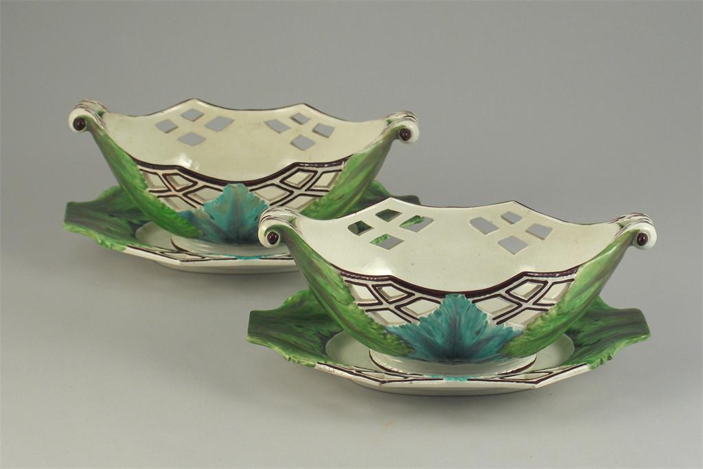 An unusual pair of pearlware boat shaped baskets and stands, moulded with leaves and brightly coloured in green and turquoise. A little good restoration. c.1800, 21.5cm. (4)