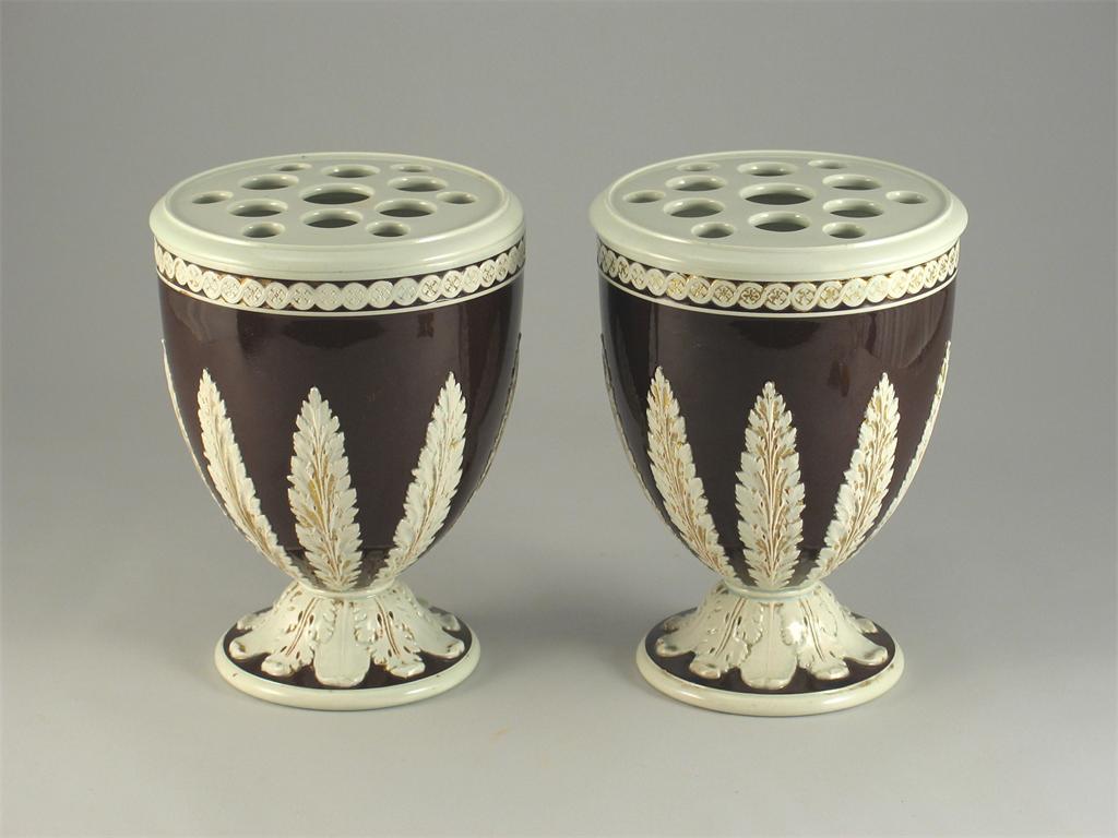 An unusual pair of Wedgwood pot pourri vases and covers, moulded with acanthus leaves and guilloche bands detailed in gold on a chocolate ground, Wedgwood impressed. One with some good restoration to the foot. Early 19th century, 18.5cm. (4)