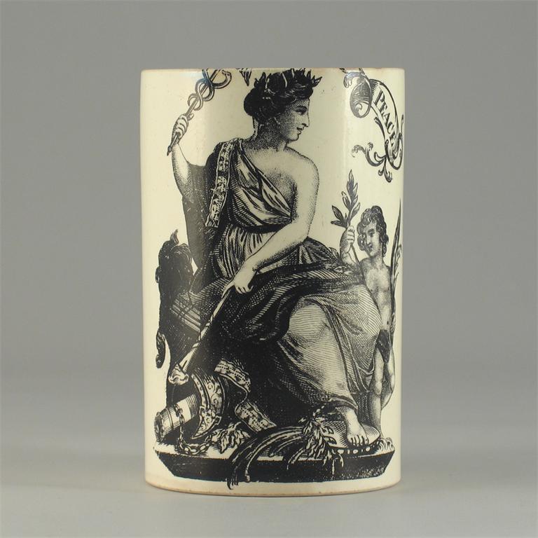 A good creamware cylindrical mug, printed in black with a figure of peace seated holding a caduceus. A few small rim chips. Late 18th century, 12.5cm.