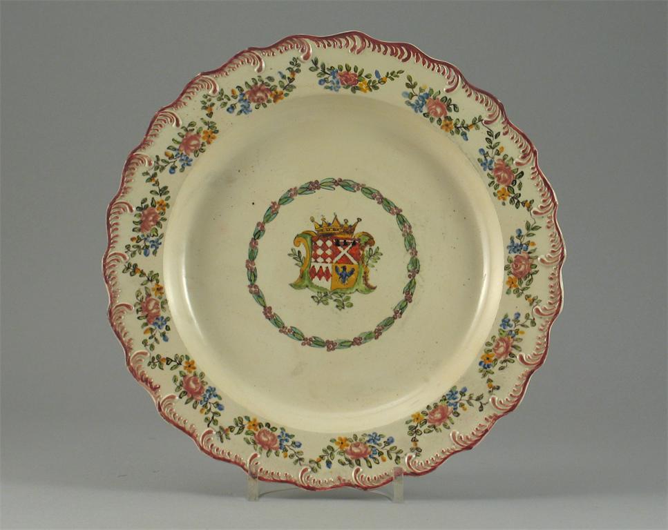 An unusual Leeds creamware armorial plate, the centre decorated with a quartered shield within a laurel wreath, the border feather moulded and painted with flower swags, 'Leeds Pottery' impressed. Some restored cracks. c.1775-85, 24.5cm.