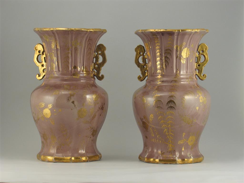 A large pair of Mason's Ironstone vases, decorated with gilt flowers on a lilac ground, impressed marks. One with a base crack. c.1820-30, 37cm. (2)