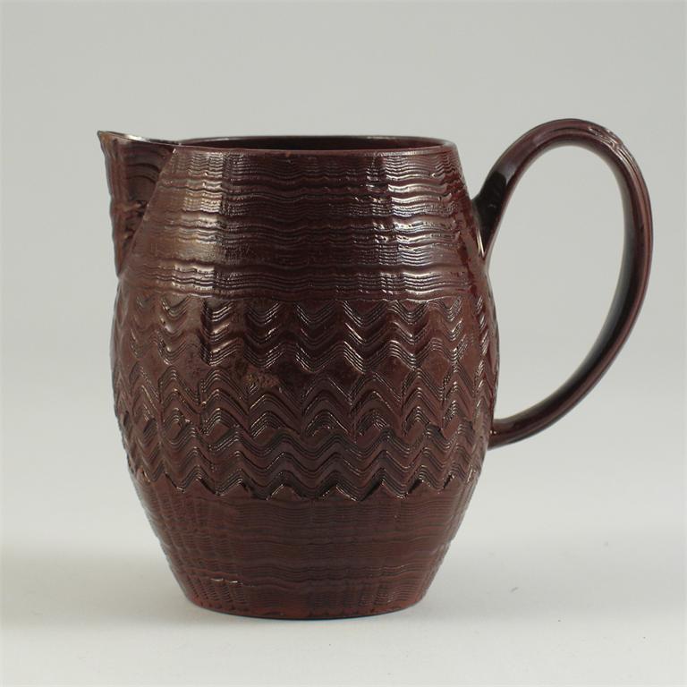 A Staffordshire redware jug, engine turned and glazed. A few small chips to the spout. c.1770, 8.5cm.
