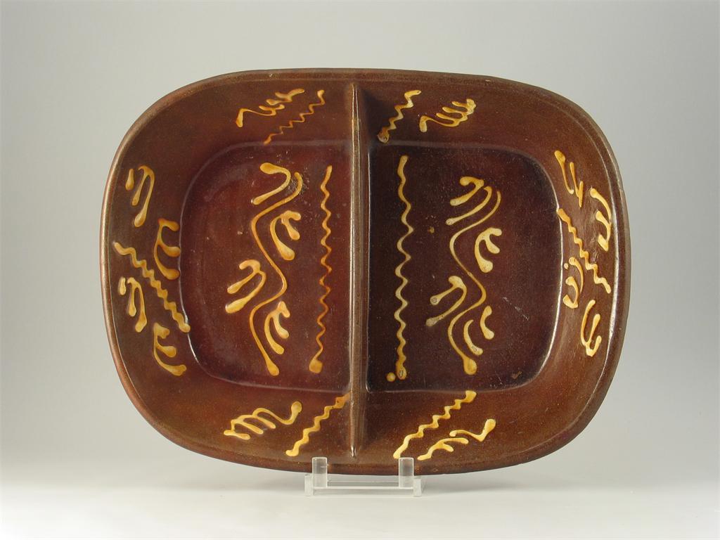 A large slipware dish, with a central division, decorated with wiggly lines and stylized motifs. Some restoration. 45cm.