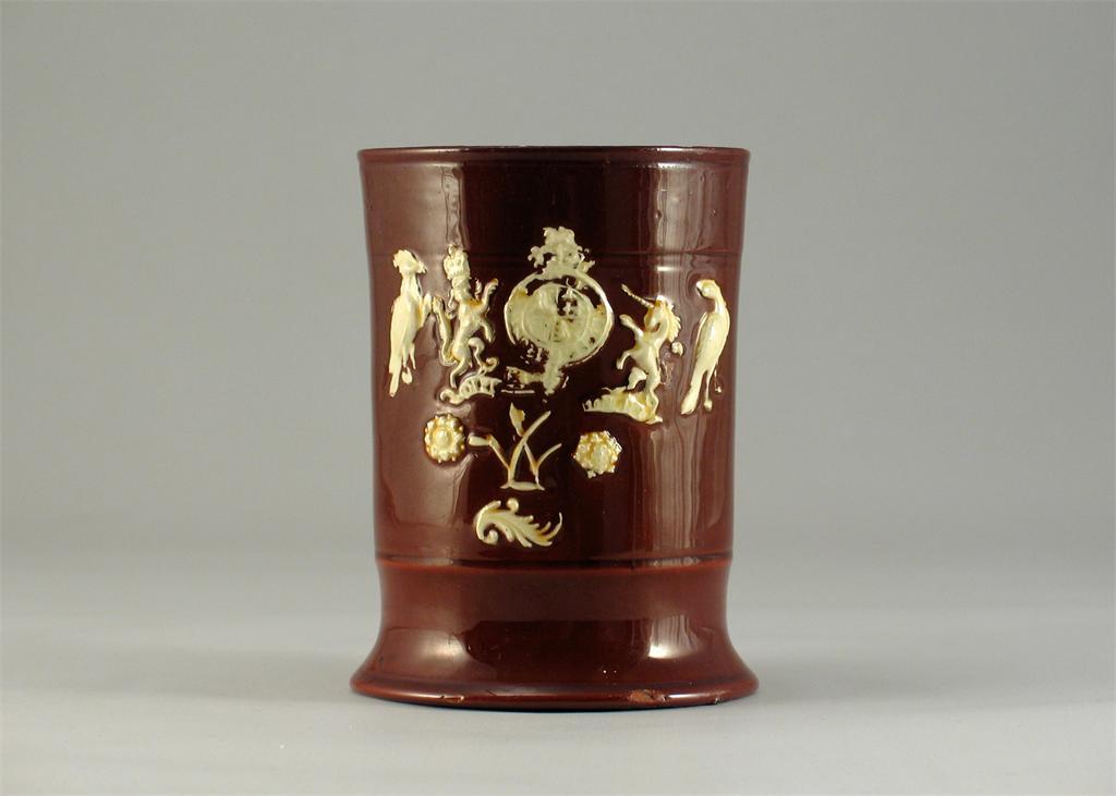 An unusual Staffordshire glazed redware mug, the body applied in cream coloured clay with a lion, unicorn, birds, flowers and leaves. A well restored rim chip and hairline. c.1760,12cm.