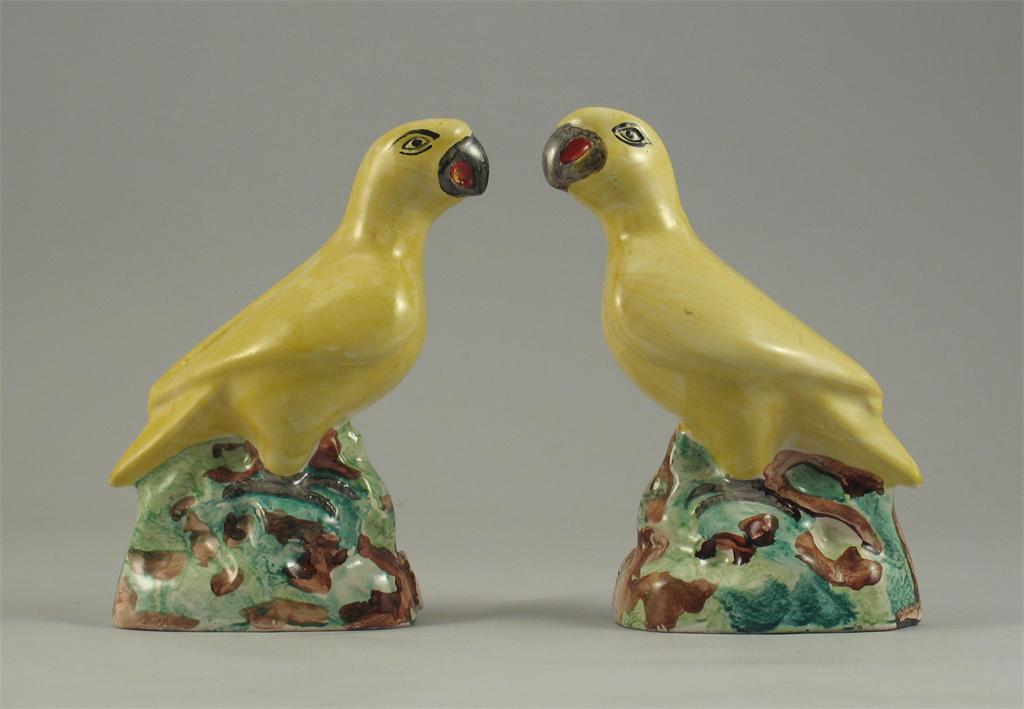 A pair of pottery models of yellow parrots, each standing upon a grassy mound, an impressed seal to the front of each mound, 15cm. (2)