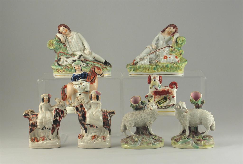 A pair of Staffordshire models, of a sleeping shepherd and shepherdess,a small pair of figures riding goats, a pair of sheep, a girl riding a horse and a spaniel, all 19th century, 16.5cm. Max. (8)
