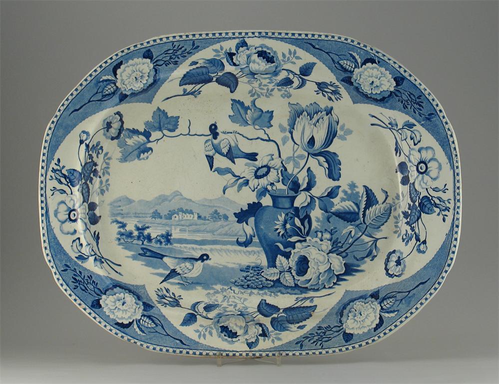 An 'Opaque China' blue printed meat plate, decorate with birds and a large vase of flowers, printed mark, c.1820, 54cm.