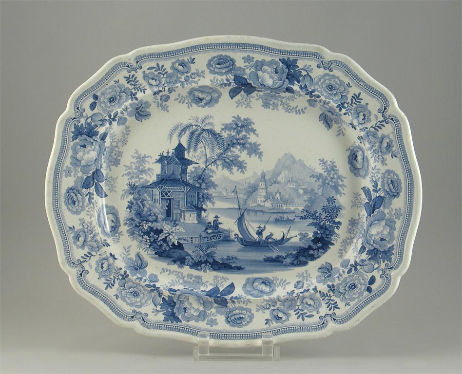 A Staffordshire blue printed meat plate, decorated with the 'Montes Pyrenenses' pattern, printed mark, 19th century, 43.5cm.