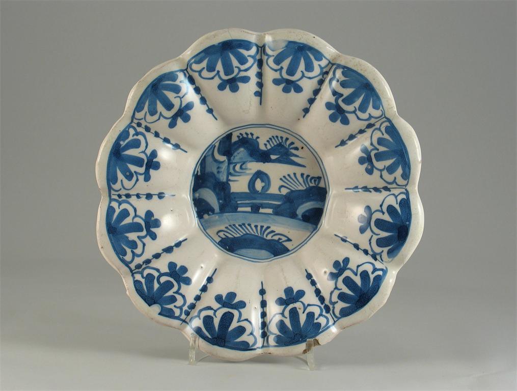 A Delft blue and white lobed dish, painted with a stylized landscape. Rim chips and feint rim cracks. 18th century, 22cm