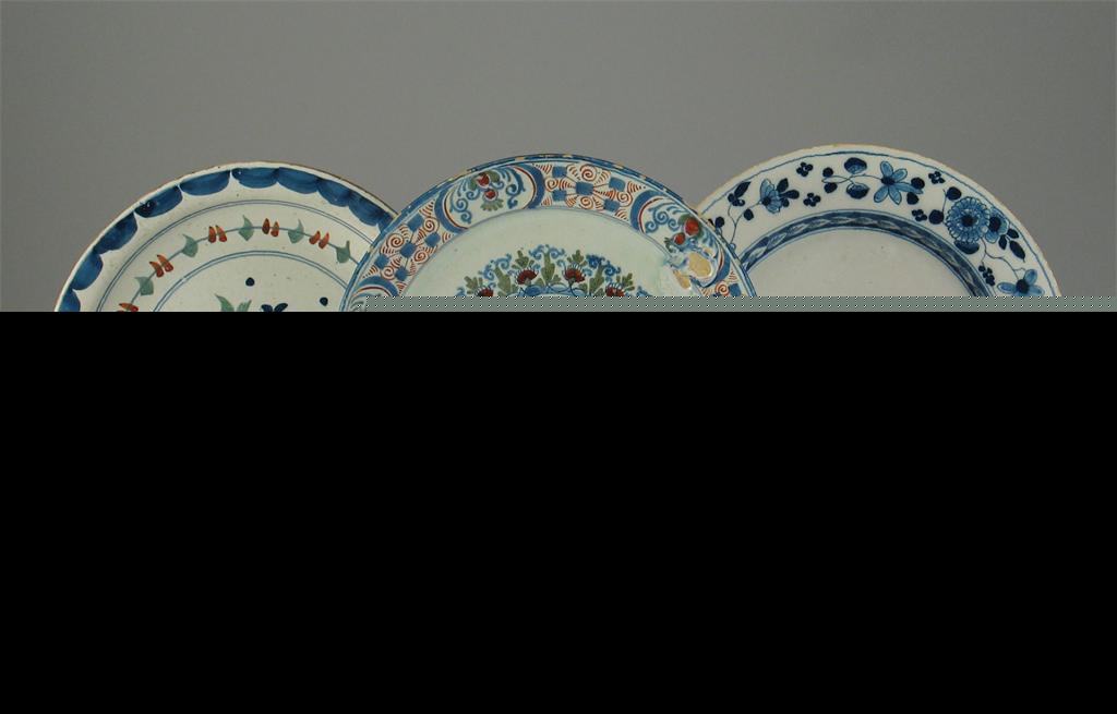Three English Delft plates, one blue and white, two polychrome, variously decorated with flowers and border designs. Two cracked. All 1st half 18th century, 22.5cm. (3)