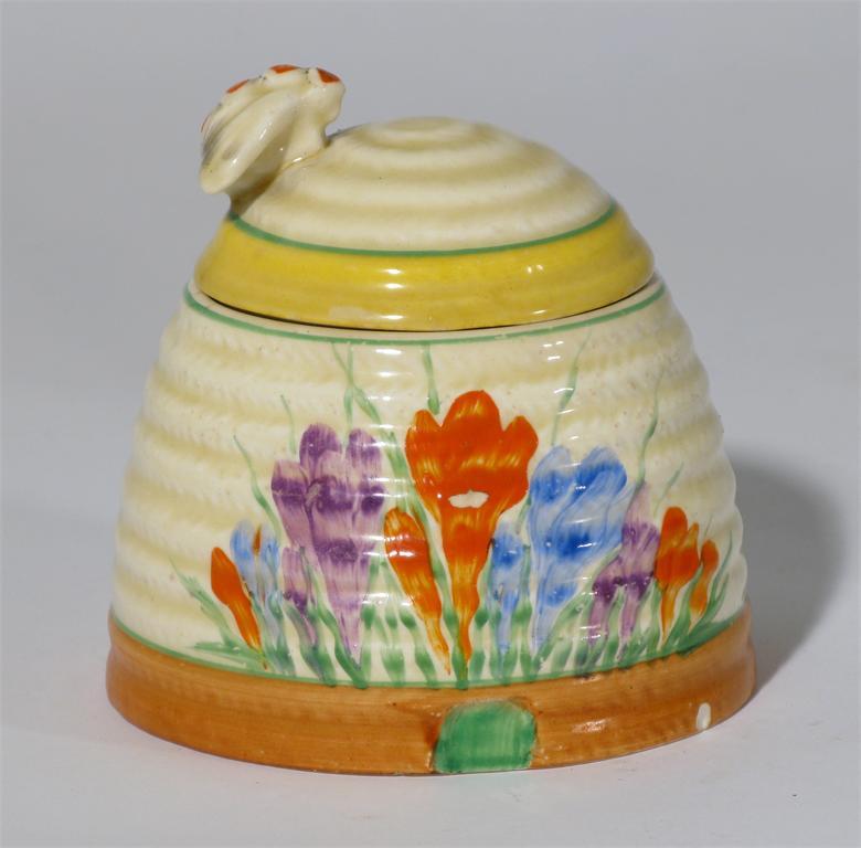 'Crocus' a Clarice Cliff Bizarre Beehive Honey-pot and cover painted in colours printed mark