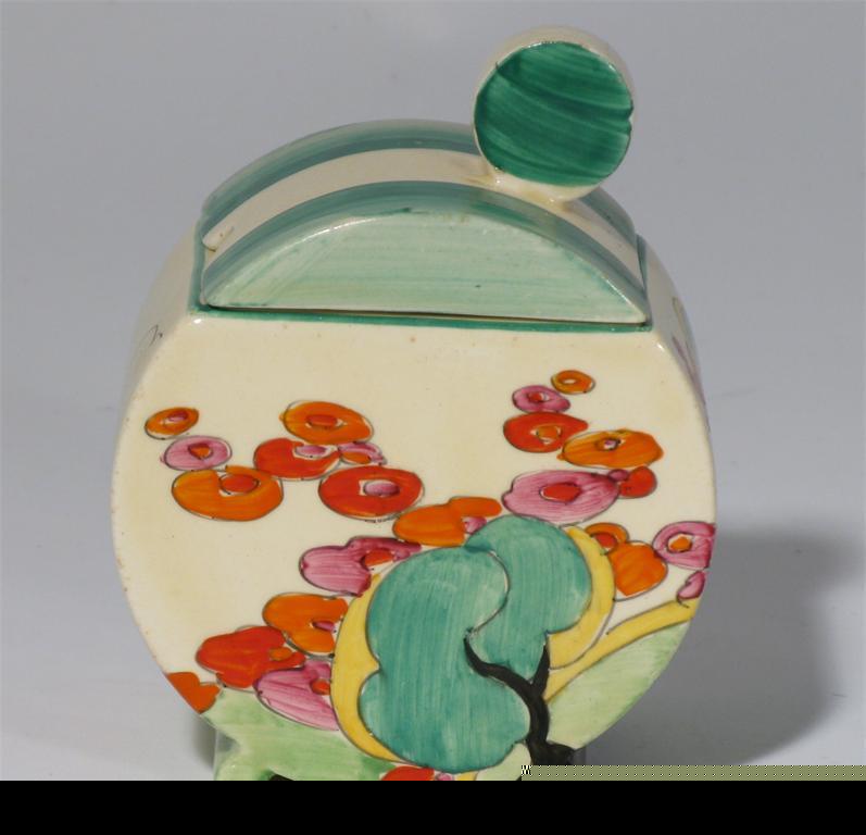 'Green Erin' a Clarice Cliff Bizarre Bon Jour preserve pot and cover painted in colours printed...