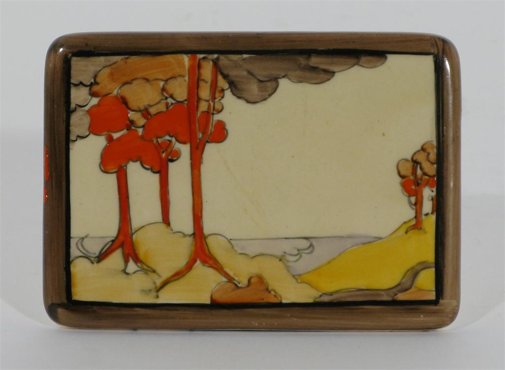 'Coral Firs' a rare Clarice Cliff advertising plaque painted in colours inside a brown band