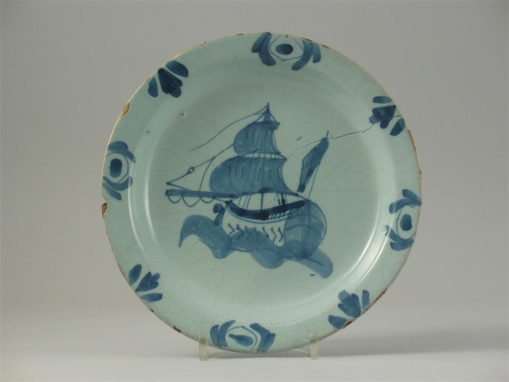 A Delft blue and white plate, probably Lambeth, painted with a galleon. A 10cm. crack. c.1740-60, 22.5cm.