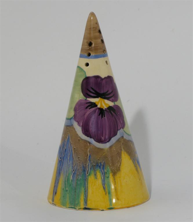 'Pansies' a Clarice Cliff Fantasque Bizarre Conical sugar sifter painted in colours printed and...