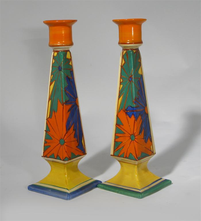 'Umbrellas and Rain' a pair of Clarice Cliff Fantasque Bizarre large Octagonal candlesticks painted in colours between orange and yellow bands printed marks, one restored to neck, the other hairline to base 30cm. high