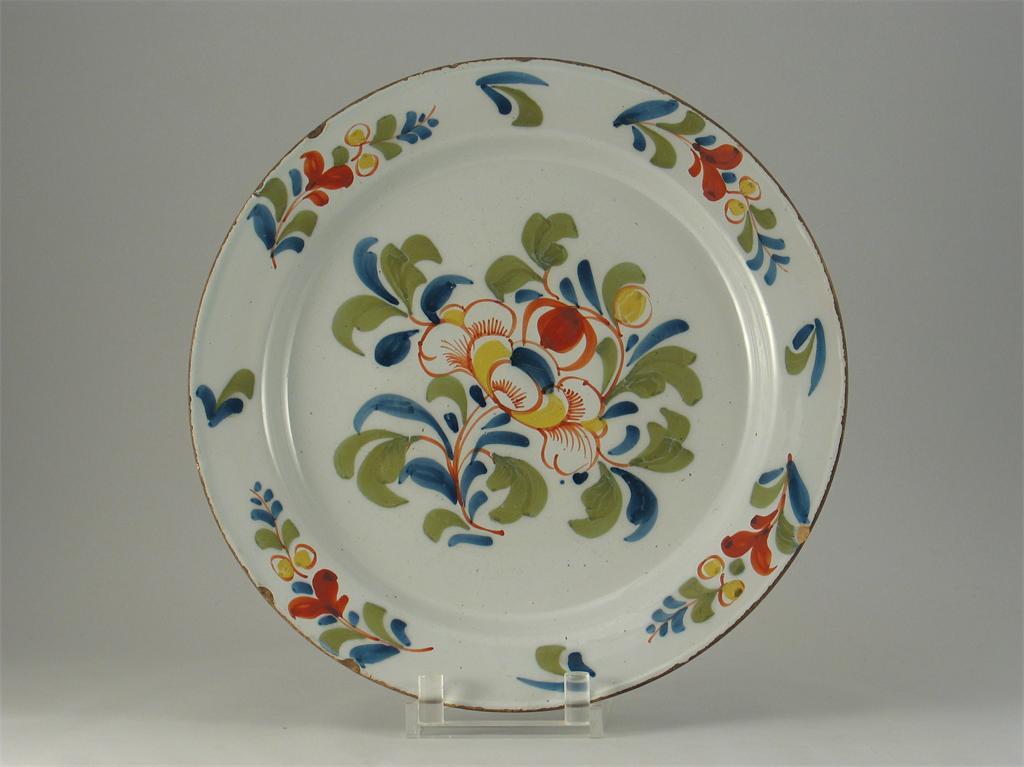 A large English Delft dish, polychrome painted with a large flower spray. A few small rim chips. Mid 18th century, 33cm.