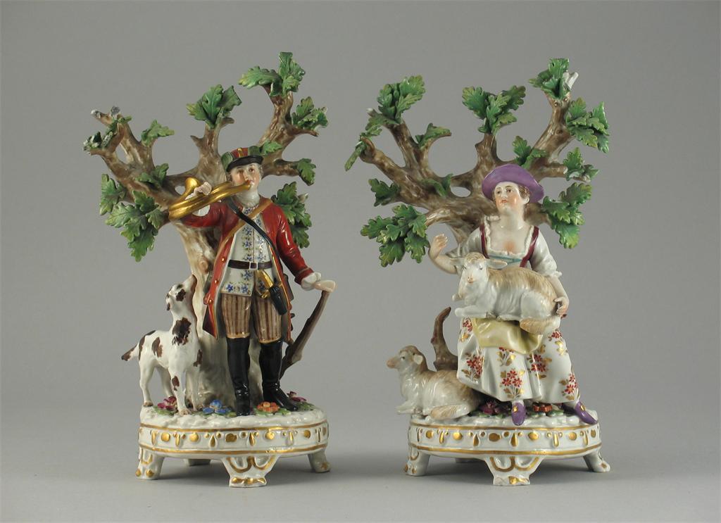 A pair of continental porcelain models, of a huntsman and companion, each before a leafy tree, he blowing a horn while his companion tends sheep. Chips to extremities. c.1900, 21.5cm. (2)