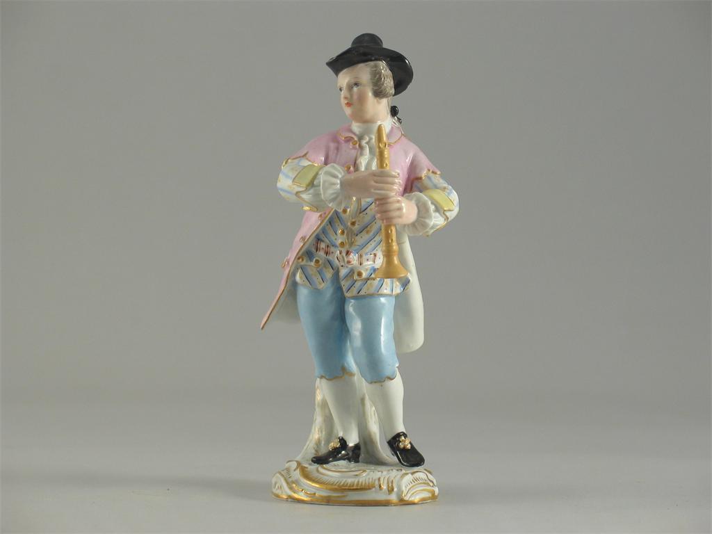A Meissen model of a piper, wearing a pink jacket and baby blue breeches, crossed swords mark. Good restoration to his hands and pipe. 19th century, 14cm.