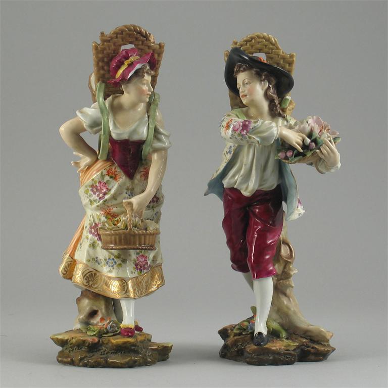 A pair of Volksteadt models of a man and woman, carrying flowers and with hods on their backs, hay forks marks. Some damage. c.1900, 24cm. (2)