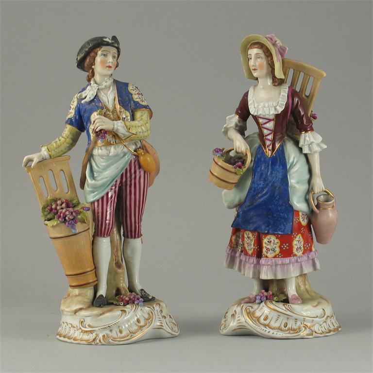 A pair of continental porcelain figures of a vintner and companion, each with a grape hod. Minor faults. c.1900, 23cm. (2)