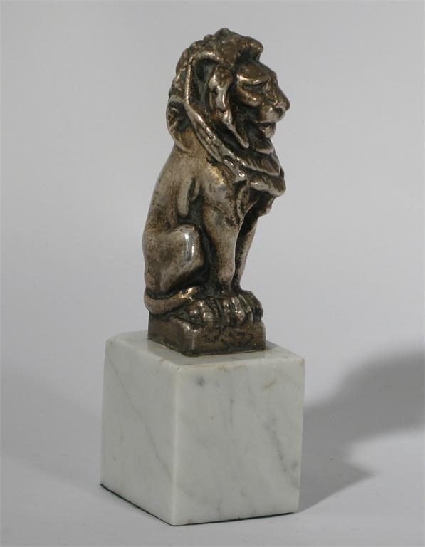 A silvered metal sculpture of a lion cast from a model by Alfred Stevens originally designed for the British Museum, on later white marble base unsigned 19.5cm. high