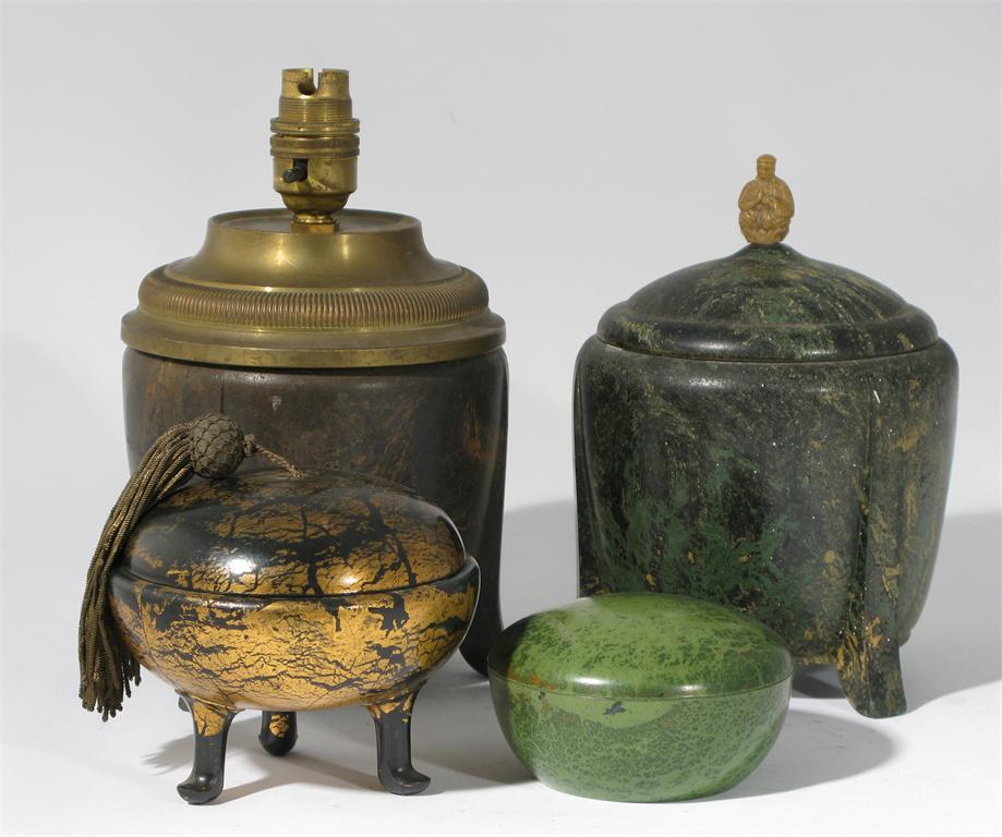 An Ebena green and black marbled plastic Tobacco jar and cover on tripod feet with Galalith figure finial, a small black and gold plastic box and cover and two others cast marks 19.5cm. high Literature Ebena 1921-1931 Kunstmuseum Dusseldorf page 97 catalogue numbers 102 and 105 for comparable shapes