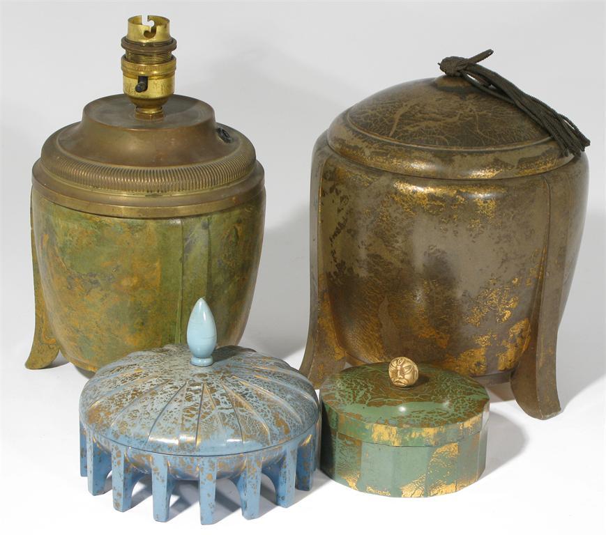 An Ebena blue and gilt plastic box and cover low dish form with numerous feet, another box and cover with Galalith mask finial, and two other Ebena items various cast marks 13cm. diam. Literature Ebena 1921-1931 Kunstmuseum Dusseldorf, page 86 catalogue 65 for a comparable pot and cover