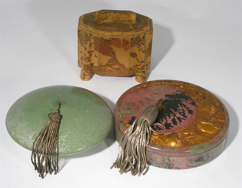 An Ebena pink, black and gold marbled plastic box and cover the cover modelled in low relief with rose border, with silver tassle finial, a low domed box and cover and another bix and cover cast marks 19.5cm. diam. Literature Ebena 1921-1931 Kunstmuseum Dusseldorf, page 65 catalogue number 11 for main piece