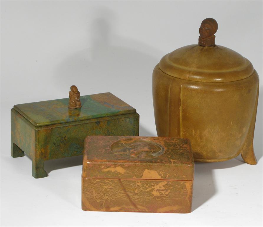 An Ebena mottled red and gold cigarette box and cover the cover cast in low relief with a female...