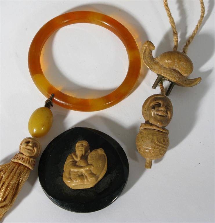 A rare Ebena Galalith plastic bell push modelled as a pierrot head, a bangle similar and a mounted brooch of an oriental sage unsigned
